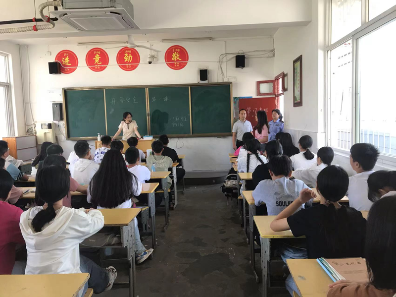 学校党支部书记、校长晏全林,副校长宋长玲同法治副校长于琼琼及警校联络员邓志豪分学部查看各班“安全第一课”开展情况,并深入部分班级,对安全工作进行再次宣讲。