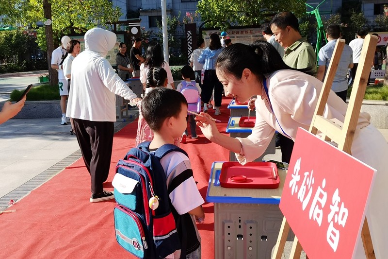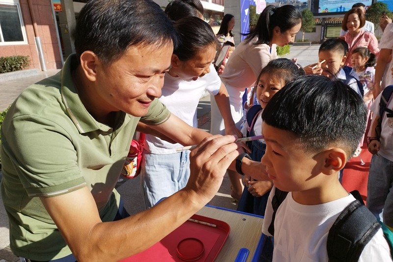 植根文化,传承经典。一年级的新生们在家长的陪同下,踏上通往幸福的红色地毯,先跨“健康快乐、筑梦未来、向阳生长和勇敢坚毅”4个跨栏;再击鼓明志;黄颉主任、学校领导和一年级老师们为孩子们点上朱砂,愿他们开启智慧,眼明心亮!走过启智门,来到操场,正衣冠、 端品行、礼拜恩师,感恩家长,最后放飞梦想气球。