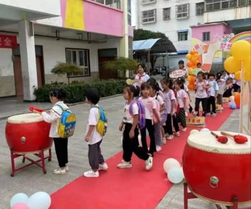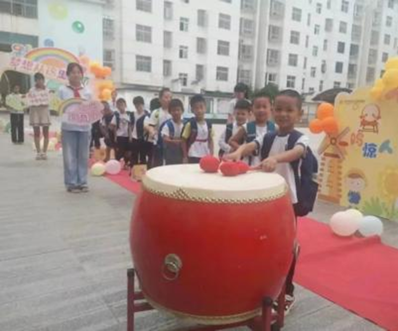 孩子们来到鼓架旁边击鼓明志,鼓声咚咚以示学生从此启蒙,敲响的每一声都孕育着一个崭新的希望,孩子们发出勇敢追寻梦想的声音,希望他们一鼓作气,一鸣惊人。一声鼓:勤学好问;二声鼓:团结互助;三声鼓:立志成才。