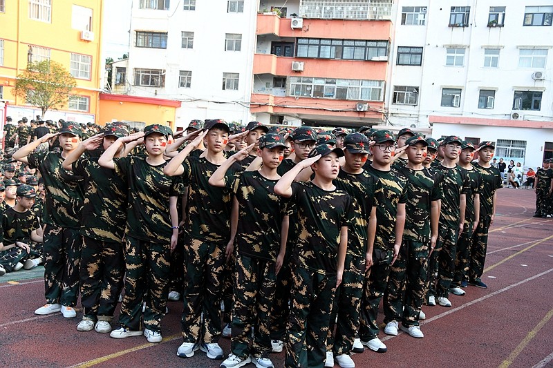 接着,九年级代表队步伐沉稳、气势如虹,在教官铿锵有力的口令声中,组成方队依次进行了分列式表演。从立正、稍息、齐步走到复杂的军事技能展示,从坚毅的眼神到规范的动作,每一个细节都展现了学生们的不懈努力和追求卓越的精神。台上,学生们以高昂的士气,展示了他们通过军训磨炼出的坚韧意志和爱国情怀。