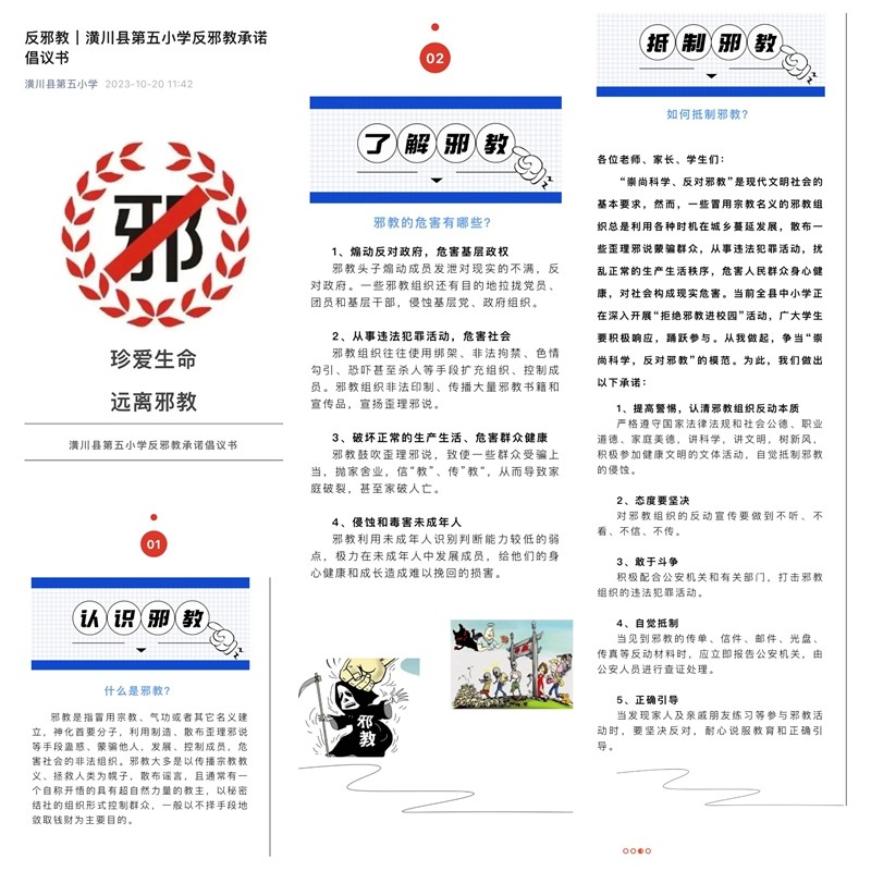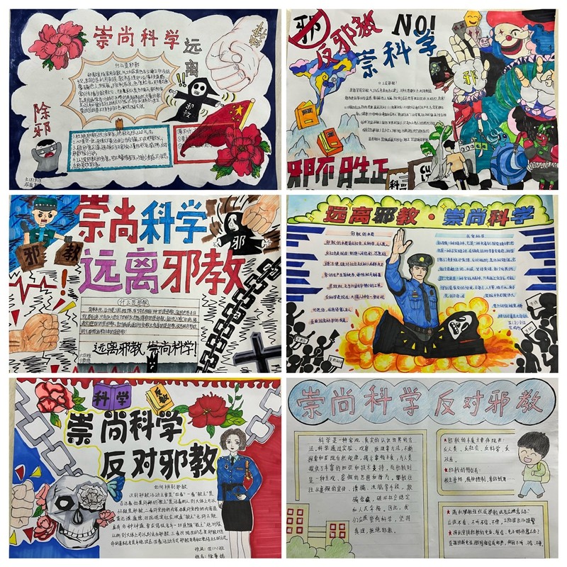 本周,以“崇尚科学,远离邪教,从我做起”为主题,利用升旗仪式对全校师生进行宣教活动;利用校园电子屏、知识展板、公众号让师生和家长们了解非法宗教活动的危害;老师和家长们进行网上“拒绝邪教”签名活动,学生们自主设计排版,将自己对反邪教的认知绘制成了一幅幅图文并茂的手抄报。