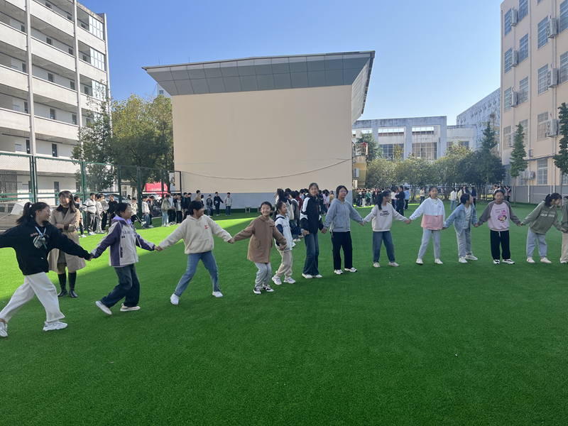 每位学生手拉手,从队伍第一排同学开始中途不得松手,根据老师的要求,快速组合成若干团队。