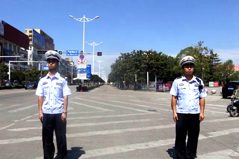 他们没有空调吹出凉爽的风,不能扇风纳凉,穿着满身装备。刺目的阳光晃得人睁不开眼睛,汗水流下,在他们坚毅的脸上留下道道痕迹,沁透的警服塌在身上,粘腻潮湿,一天下来凝结出层层的汗渍。