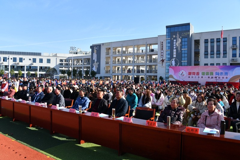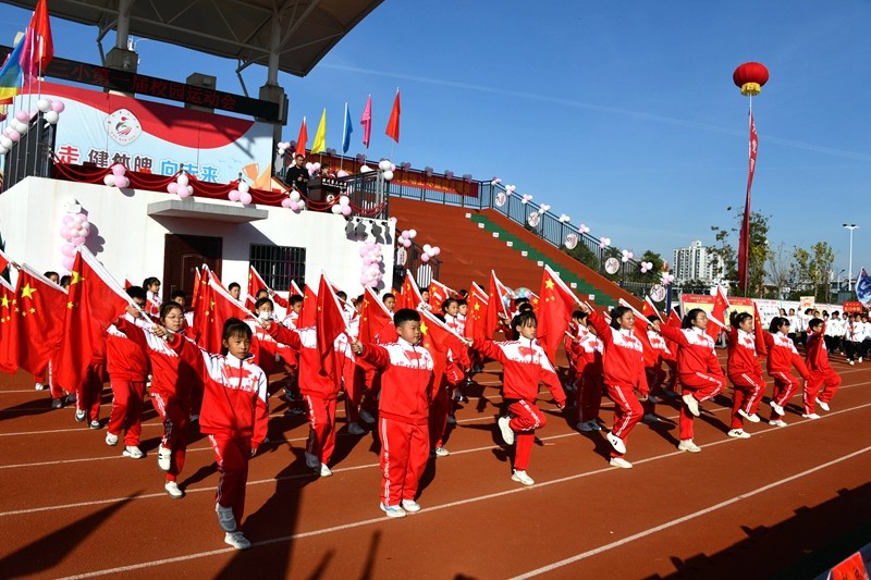 本网讯(蔡宗荣)为落实双减政策,推进五育并举,增强学生体质,培养德智体美劳全面发展的社会主义建设者和接班人。11月18日上午8:30,潢川三小第一届校园运动会隆重开幕,绿茵场上乐曲高奏,彩旗飞扬,县教体局党组副书记、副局长晏杨,县人民检察院第五检察部主任赵子国,县教体局勤俭办主任胡祥兵、普教股副股长蔡利军、三小迁建指挥部代表胡学江,三小警务联络员张旭阳,光州教育公司负责人,学校历届退休老干部代表等领导应邀出席开幕式。全校近3700名师生、240余名家长委员会代表参加了此次运动会开幕式。开幕式由学校工会副主席张魁、幼儿园园长崔银丽主持。