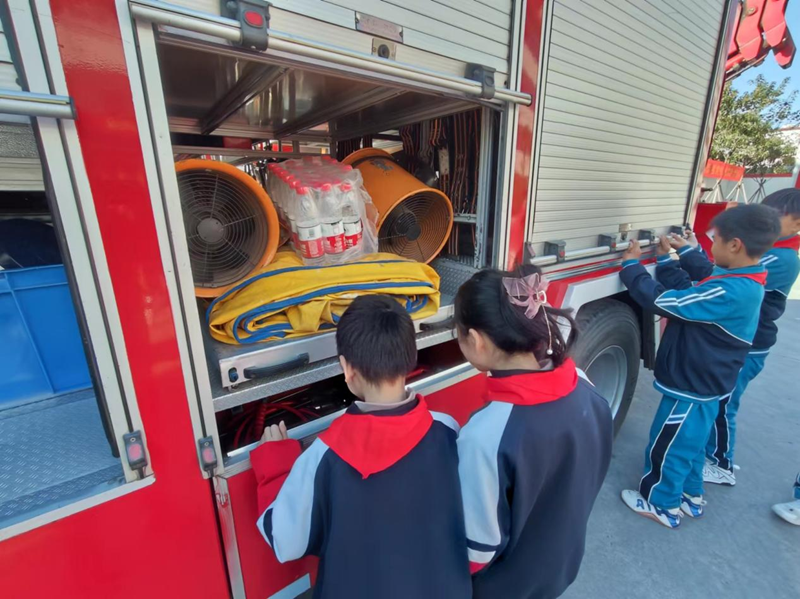 随后,在宣传人员的带领下,同学们参观了消防车辆和部分消防器材装备,消防员针对其不同功能、用途和使用方法逐一进行讲解。