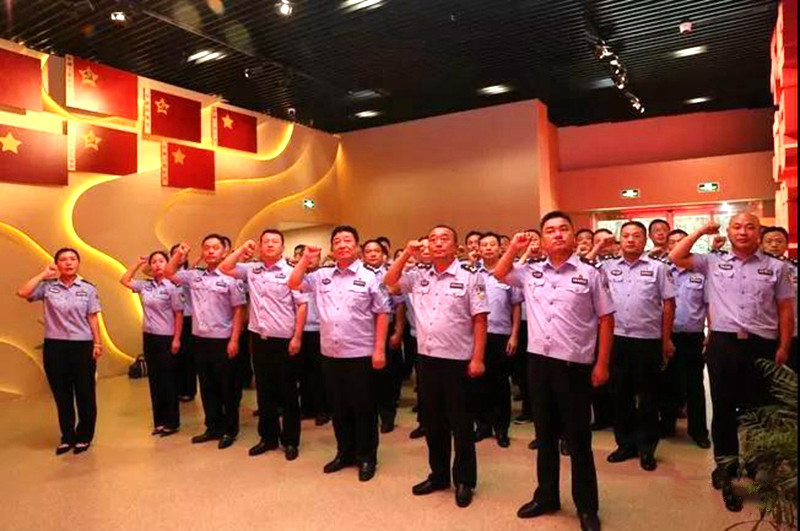 在“守初心”展厅的入党宣誓墙前,面对鲜红的党旗,民警们高举右拳,重温自己对党忠诚的誓言,表明了不忘初心,牢记使命,砥砺前行的决心。