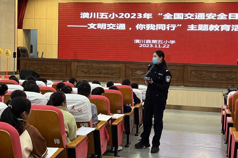 本网讯(鄢秋莹)交通安全,教育为先。为进一步加强交通安全宣传教育,有效提升师生交通安全意识,使师生自觉遵守交通法规,提高自我保护能力,2023年11月22日下午,潢川五小特邀县交警大队徐警官一行三人莅临学校开展了全国交通安全日“文明交通 你我同行”主题教育活动。