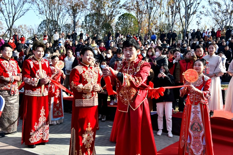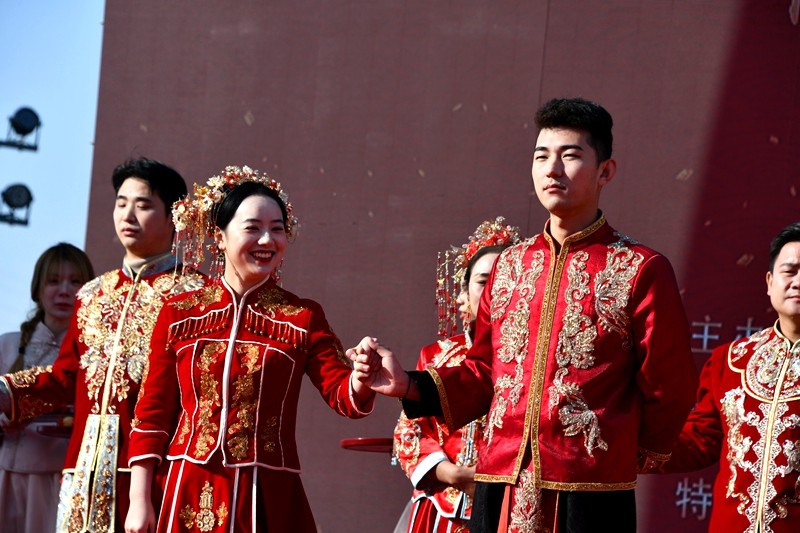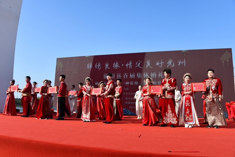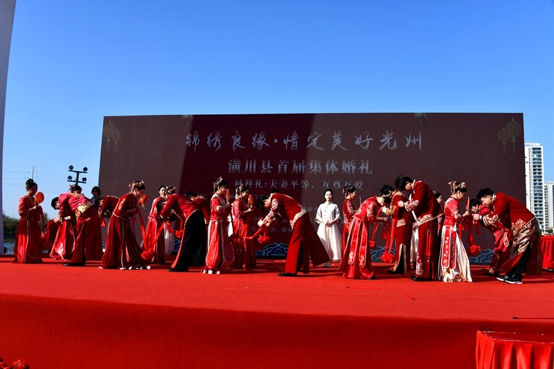 在庄严而浪漫的集体婚礼上,10对新人身穿红色中式礼服,伴随着古典唯美的音乐,在亲人及观礼嘉宾的瞩目下步入会场。他们行沃盥礼、合卺礼、解缨结发礼、执手礼……沉浸式体验传统中式婚嫁仪式,共同翻开了幸福的人生新篇章。涂白亮为新人证婚,与会领导为新人颁发“潢川县婚俗改革宣传大使”聘书。