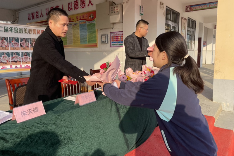 会上,教务主任卢敏宣读期中考试中进步之星、单科第一、优秀学生、学习标兵学生名单。校长詹明付和副校长许大伟为获奖学生颁发奖状和鲜花,随后学生向个自家长献上鲜花,感谢他们的辛勤付出。
