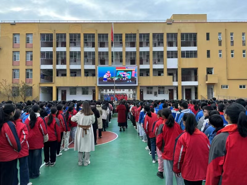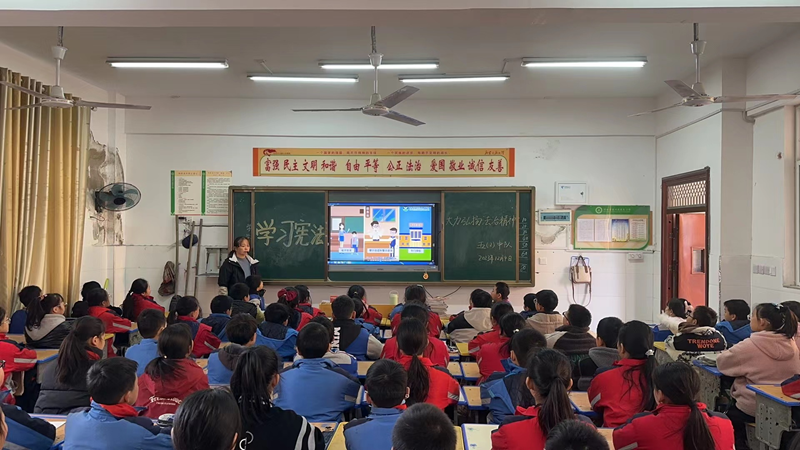 通过大屏播放“阳光少年 与法同行”宣传片,向学生展示了宪法就在我们身边,时刻守护着我们的安全。