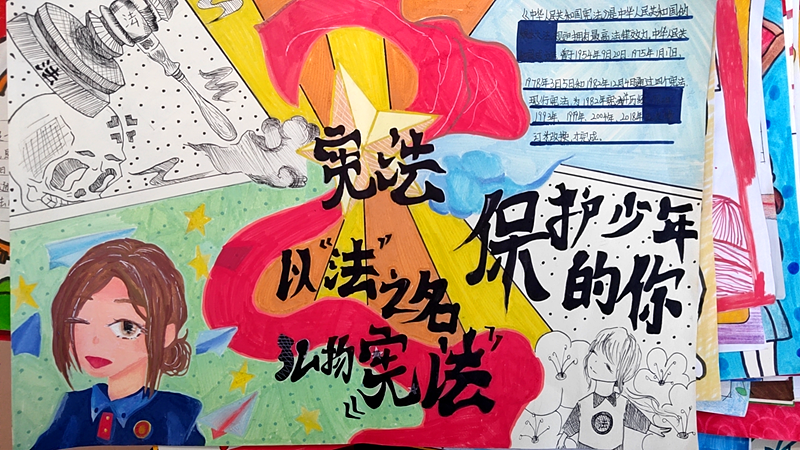 同学们用手中的五彩画笔描绘了宪法在心中的崇高地位,宪法在笔下变得更加栩栩如生,一幅幅鲜明靓丽的作品都体现出学生们对宪法精神的理解。