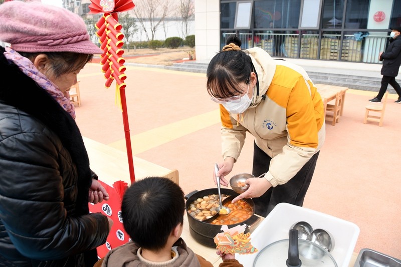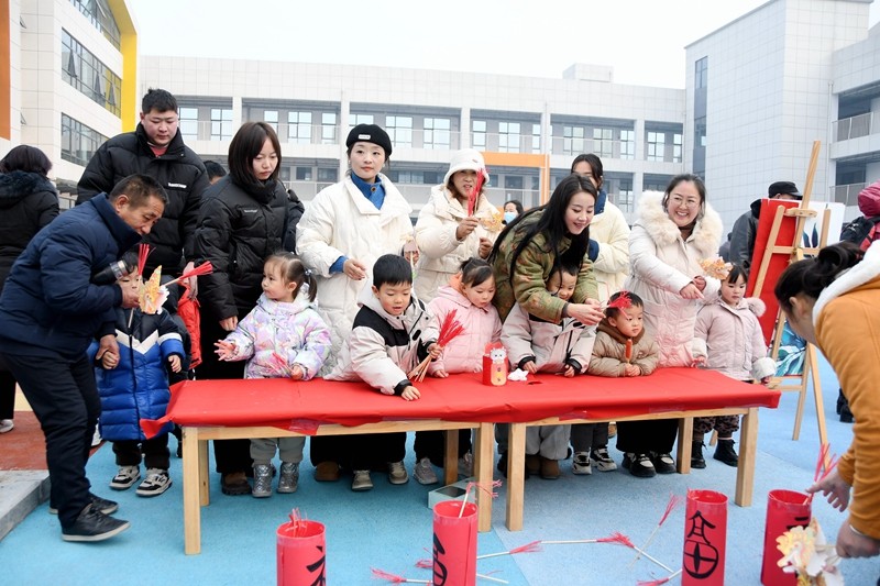 除了表演环节,幼儿园还为孩子们精心设计了游园活动。摊位上摆满了各种传统小食和手工艺品,糖葫芦、饺子等美食香气四溢。游戏环节更是趣味盎然,投壶、猜灯谜等传统游戏让孩子们乐在其中。整个幼儿园变成了一个充满欢乐和童真的小天地。