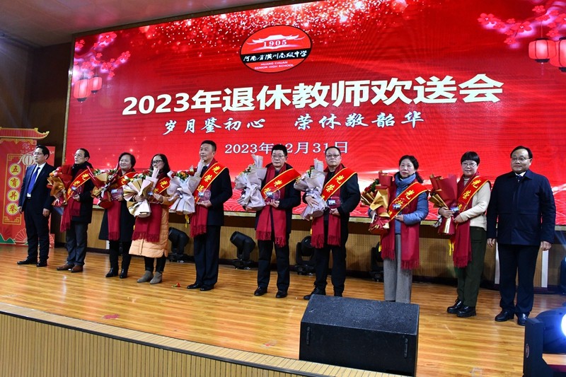 晚会期间,学校还为在首届文体艺术节中获奖的学生举行了颁奖仪式。特邀领导为获奖学生颁发荣誉证书和奖品,表彰他们在艺术节中的优异表现。此外,为感谢退休教师们的辛勤付出,学校为2023年光荣退休的资深教师们举行了庄重的欢送仪式。作为退休教师代表,李耀东老师深情回顾了自己的教育生涯,言语中充满了对教育事业的无尽热爱、深深的眷恋以及对母校的由衷感激。校领导为退休教师们献上鲜花与礼物,并与他们合影留念,记录下这珍贵的一刻。