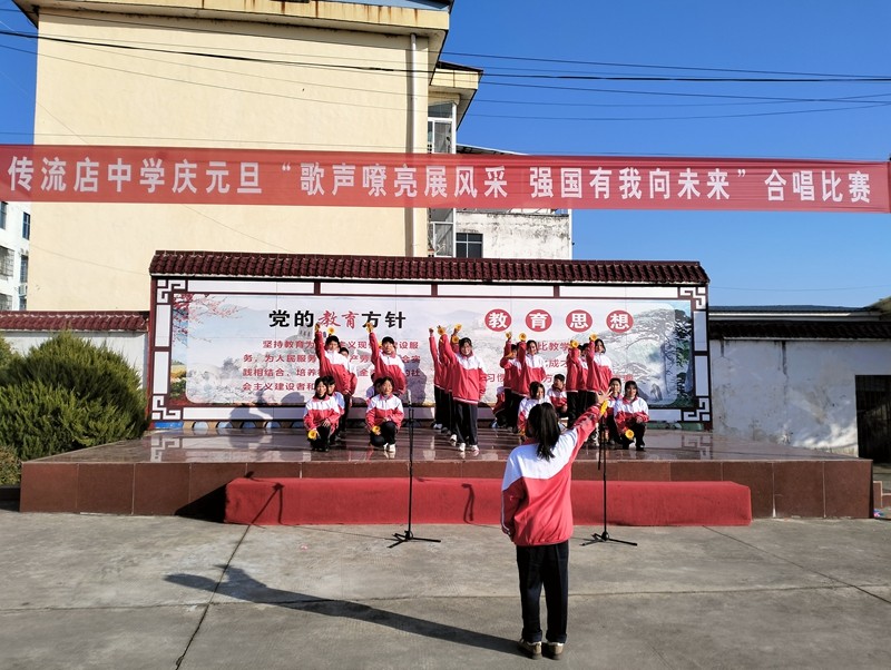 本网讯(徐刚)为深入贯彻党的二十大教育方针,培养学生的爱国情怀,也为了丰富校园文化生活,展示同学们的文艺特长,展现班级精神风貌,2024年1月3日下午,潢川县传流店中学举行庆元旦“歌声嘹亮展风采,强国有我向未来”合唱比赛。