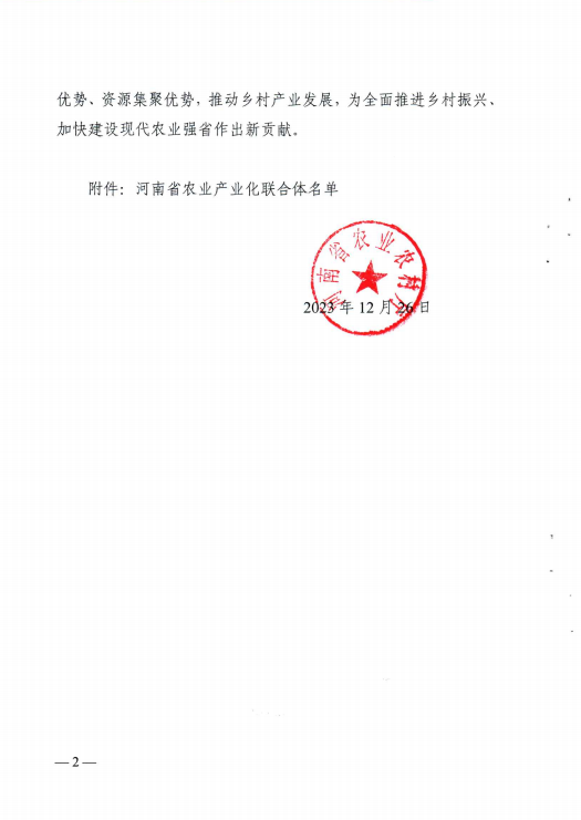 小寒节气刚过,华英公司又传喜讯。近日,豫农文(2023)553号文件下发河南省农业农村厅关于农业产业化联合体认定名单的通知,华英公司榜上有名。此次认定是经企业申报,各级农业农村部门逐级审核,经省人民政府同意,农业农村厅组成专家组评审、公示后进行认定公布。