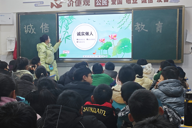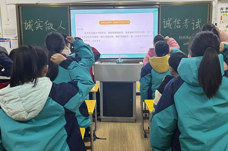 班会课上,各班班主任都通过播放课件,从诚实做人、诚信考试、答题技巧、诚信格言到诚信宣言五个环节,让孩子们懂得了“车无辕不行,人无信不立”的道理。老师们深入浅出的讲解,教育孩子们要发扬诚信作风,从小追求真善美,以实际行动践行社会主义核心价值观,在即将到来的期末学业水平测试上,用诚实做笔,交上一份满意的答卷。