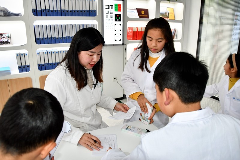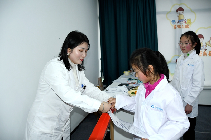 为让小记者们亲身体验视力检测的过程,万新眼科特意安排了模拟体验环节。小记者们穿上白大褂,模拟医生进行视力检测,亲身体验了视力检测的重要性和实际操作流程。这一环节让他们更加深入地理解了视力检测的实际意义。