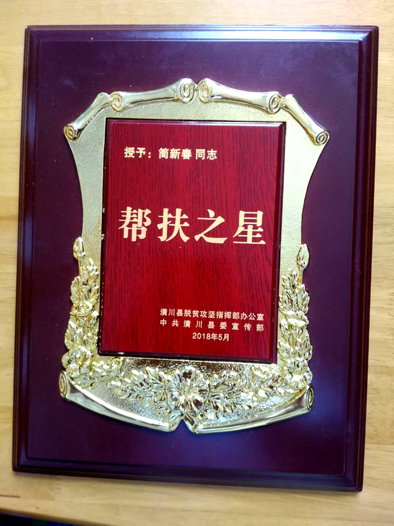 为表彰其在扶贫工作中所做出的突出贡献,潢川县脱贫攻坚指挥部办公室、中共潢川县委宣传部授予该公司总经理简新春同志“帮扶之星”荣誉称号。