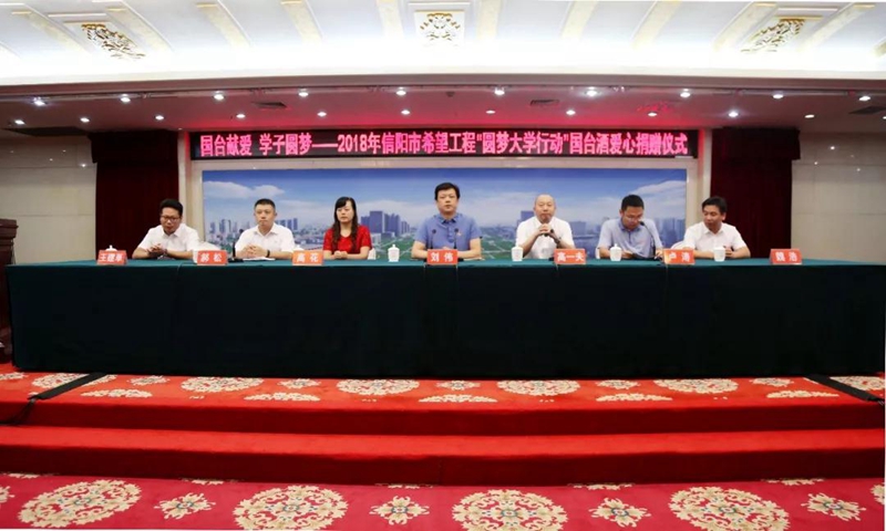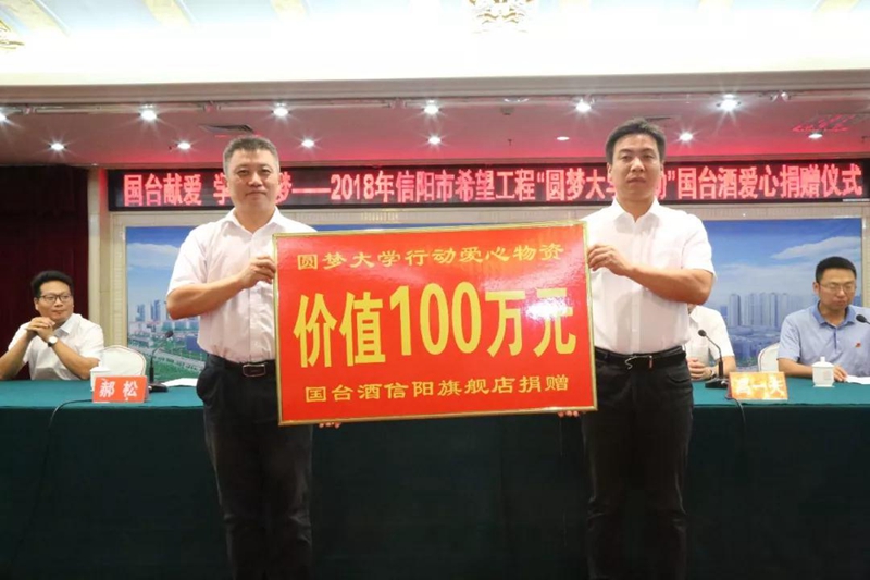 团市委隆重举行2018年信阳市希望工程“圆梦大学行动”国台酒爱心捐赠仪式