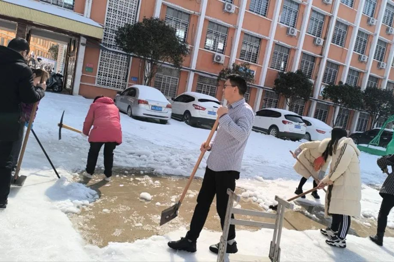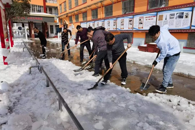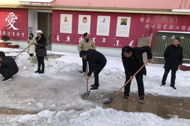 天气稍暖,坚冰稍溶,教职工们齐出力,手握各种清雪除冰工具,将校园门口、道路、前后操场、学生活动地点的冰雪一一铲除。活动中,大家热情高涨、卯足干劲,分工明确,积极配合,用身体力行的劳动呈现出热火朝天的别样风景。