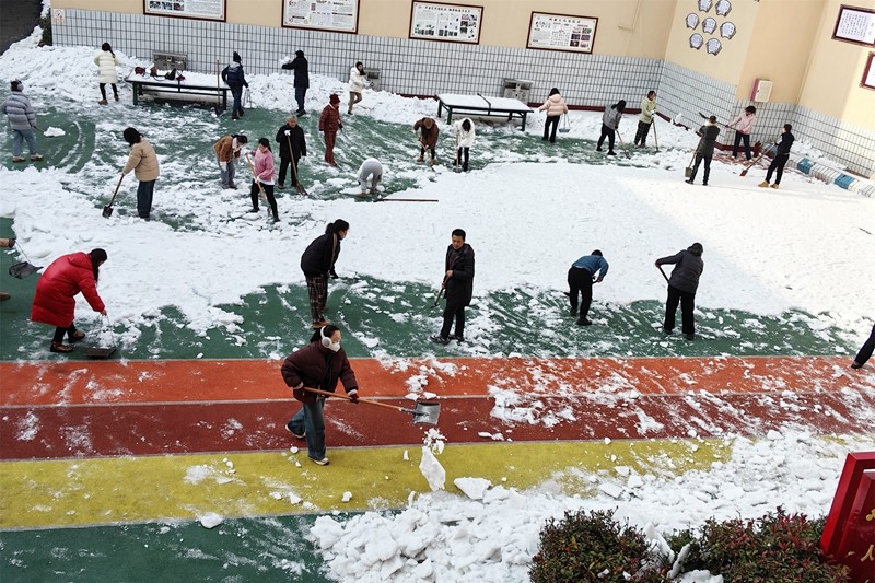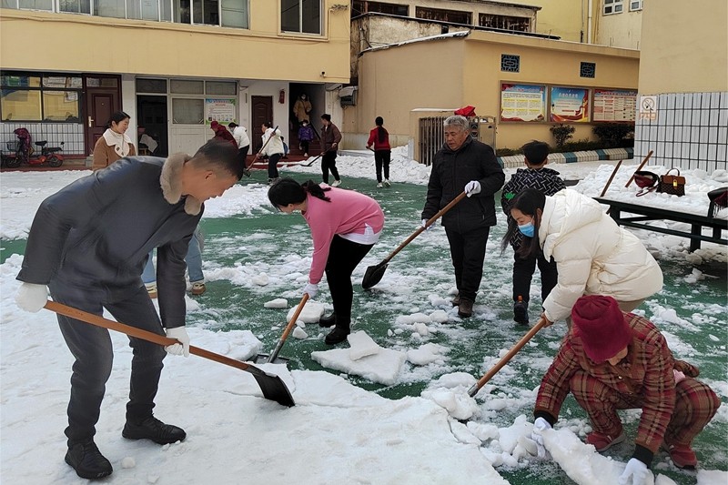 校园里,局包校领导艾堂钟和老师们以身作则、率先垂范,家长志愿者们紧密合作、配合默契。大家各司其职,克服寒冷的天气,挥动着铁锹、笤帚、簸箕等工具,推、铲、扬、堆,多种方法齐上阵,将积雪冰块清理到操场周边。面对厚厚的积雪,大家争先恐后、干劲十足,经过两个小时紧张而有序地破冰除雪,终于为孩子们开辟出了整洁的活动场地,清除了安全隐患,确保开学工作能够顺利进行。大家劳动的热情和团结的力量让这个冬日变得格外温暖,证明了家校携手的巨大力量。