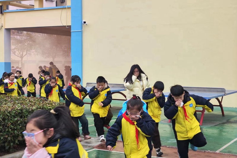 上午10时15分,学校执行校长黄维民宣布演练开始。随着警报声响起,各班级反应及时,同学们捂住口鼻,俯着身快速离开教学楼,由班主任和中队辅导员有序组织疏散,集结至操场安全区并清点人数。