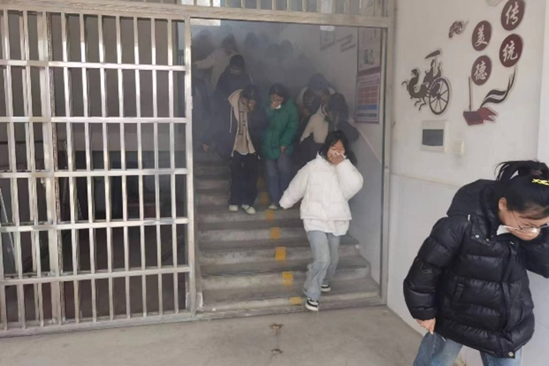 警报声一响,师生们迅速按照疏散路线开始撤离。同学们一个个镇定而严肃,用湿毛巾捂住口鼻,迅速而有序的从通道口撤离“火灾”现场。楼内疏散人员按照预先的消防演练方案疏散学生,保证在楼内学生的安全,以免慌乱中出现拥挤或踩伤学生现象,学生们逃生到操场指定位置集合。