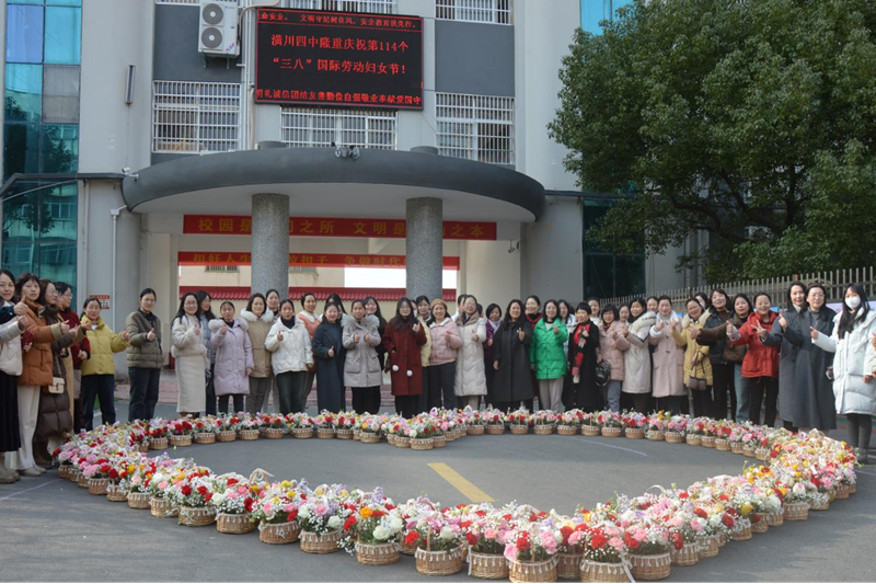 3月8日,LED屏幕墙上轮番播放着“潢川四中隆重庆祝第114个‘三八’国际劳动妇女节!”的字样,营造出浓厚的节日氛围。支部书记、校长曹伟在屏幕前摆放了精心制作的“心型”大花篮,为每位女教师送上了花篮和节日的最真挚的祝福,表达了对她们辛勤工作的诚挚感激。女教师们怀抱花篮,笑脸如花,充满活力,激情澎湃,心中自觉达成为教育事业你追我赶,不愿居于人后的担当意愿,整个校园被和谐温暖的气氛所笼罩,形成了龙年伊始的良好势头。