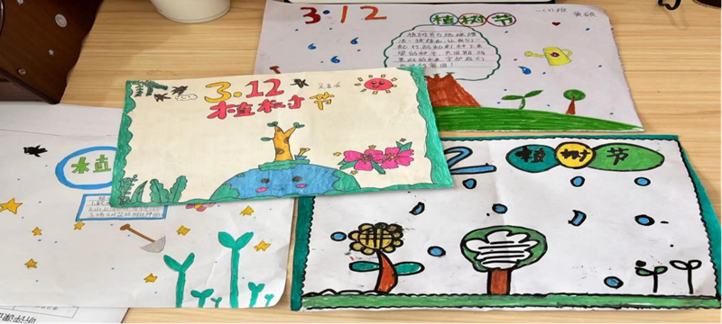 班会后,各班同学拿起铲子、水壶,为树木培土、浇水,种下希望的种子,为春天留下一抹绿色。低年级的绿色在纸上跳跃,纯真的孩子们用稚嫩的小手描绘出树木喝水、抽条、挺拔的过程。瞧,地球脑袋上还长着一颗青葱的小树呢,大家都是地球的一份子,更应该从小事做起,从自我做起,保护每一抹绿色,每一棵树苗。
