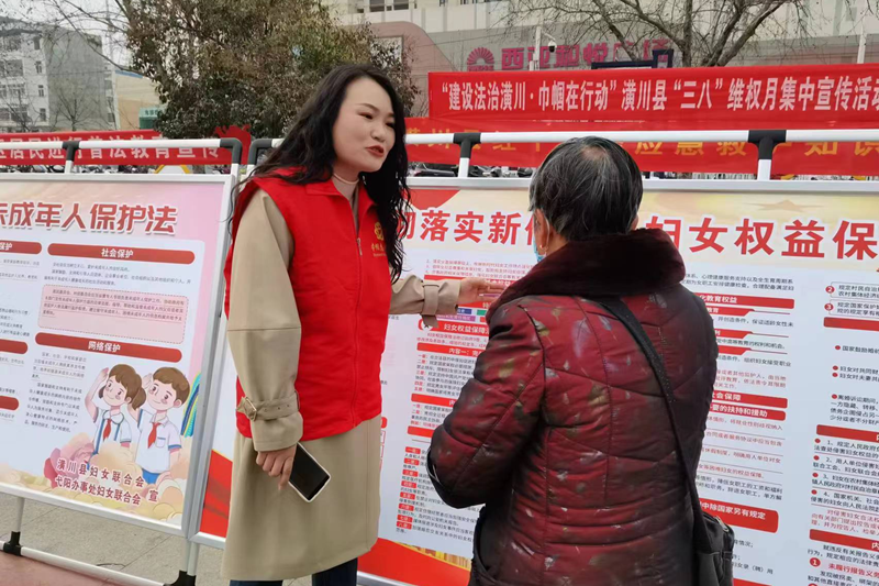 本网讯 为深入践行习近平法治思想,贯彻落实习近平总书记关于依法维护妇女权益的重要指示批示精神,切实提升广大妇女群众的法律意识和依法维权能力,3月14日上午,潢川县妇联联合县科协、县红十字会、县残联、县法院、县检察院、县公安局、县司法局、弋阳办事处在东关社区弋阳广场开展“建设法治潢川·巾帼在行动”潢川县“三八”妇女维权月集中宣传活动。