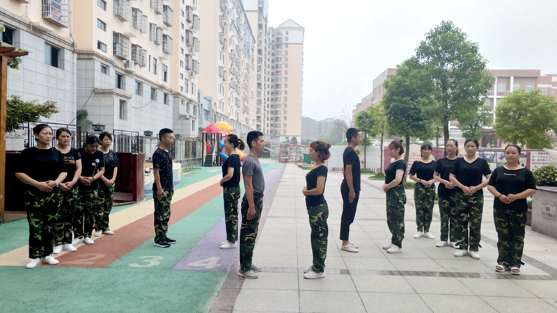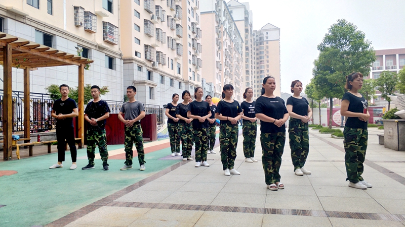 潢川网讯(詹进)为加强幼儿园管理,提高幼儿教师个人素质和管理服务能力,增强员工工作的积极性,切实改变工作作风,提升集团整体形象,营造积极向上的精神风貌,8月26日,开学前,北大附属潢川实验幼儿园分批次组织教师进行团队军事密训活动。