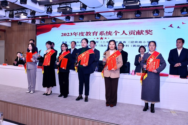为2023年度教育系统获得个人贡献奖教师颁发奖杯及证书