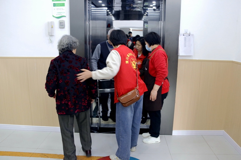 活动前,志愿者和服务中心的护工们帮助行动不便的老人们,确保他们安全舒适地来到活动现场。