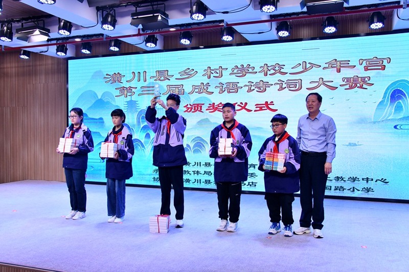 本网讯 5月10日,潢川县乡村学校少年宫第三届成语诗词大赛决赛在黄国路小学报告厅圆满收官。县教体局党组书记、局长胡波,县新华书店总经理刘永峰,局党组副书记、副局长晏杨,县新华书店副经理翁斌等领导与师生一起现场观看比赛,并为获奖代表队颁发奖品、奖杯。