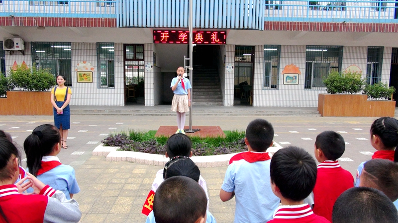伴随着雄壮的国歌,五星红旗冉冉升起,开学典礼正式拉开帷幕。首先,学校校长刘敏军对新老师和新同学表示欢迎,并向所有学生提出新学期新期望,希望所有七小的孩子们能成为爱读书、讲文明懂礼仪、有责任心并珍爱生命的人。恰逢教师节,刘校长对所有教职工表达了节日的祝福及衷心的问候。优秀教师代表宋传平老师、一年级学生代表曾铭炎小朋友、毕业班学生代表徐红玉同学先后做了发言,随后,在学生代表张雨炫的带领下,全校学生举起右手在鲜艳的国旗下庄严宣誓,“养良习,每天进步一点点,爱读书,每天收获一点点……”宏亮的声音响彻校园的每个角落。