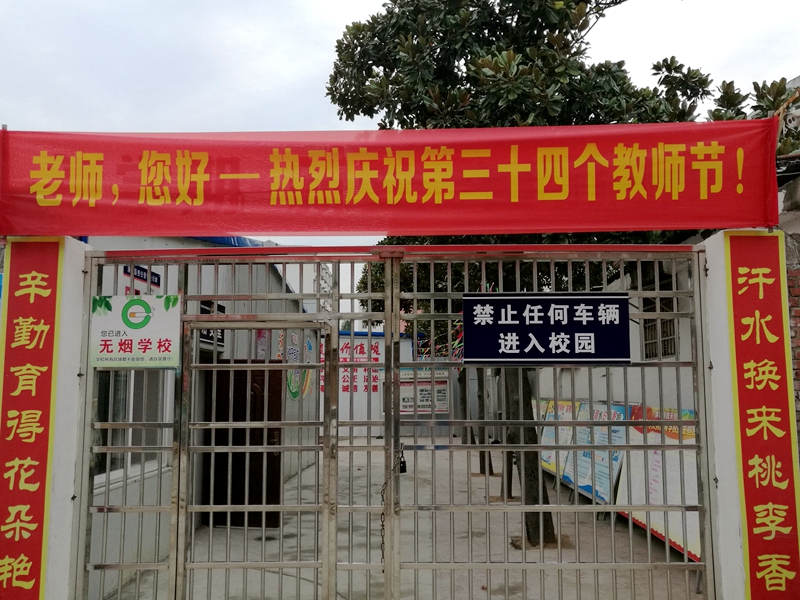 大门上悬挂热烈庆祝第三十四个教师节标语
