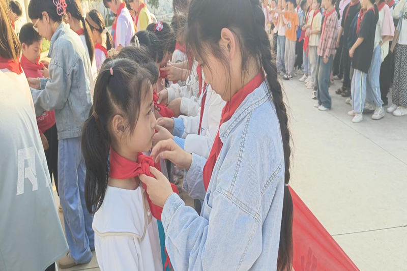 仪式在庄严的队歌中拉开序幕,全体学生齐唱队歌,队旗高高飘扬,象征着孩子们的理想和希望。随后,大队辅导员程灿灿老师宣读了新队员名单,新队员们戴上红领巾,高举右拳,在队旗下庄严宣誓,表达了自己为共产主义事业奋斗的决心。