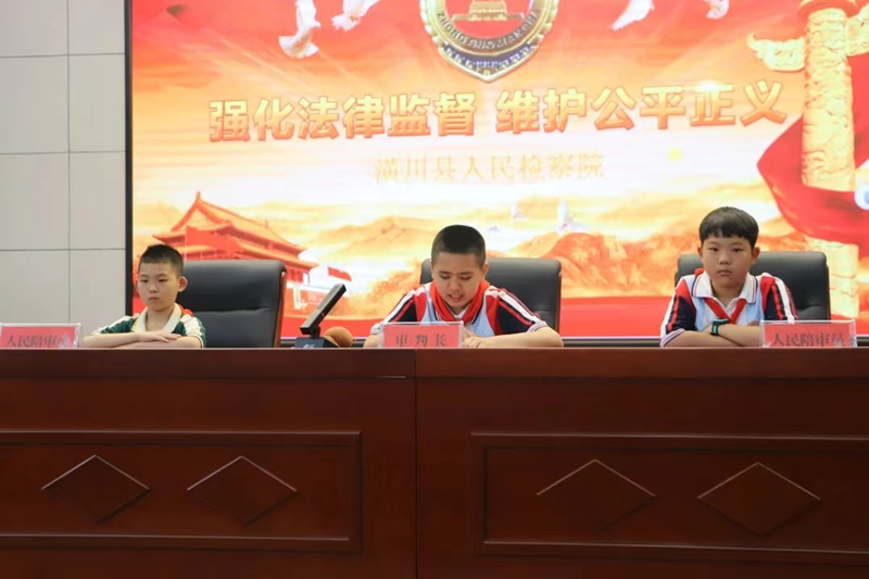 随后,学生及家长代表在会议室一同观看了信阳市检察院制作的未检普法微电影《另一种可能》和县检察院制作的宣传视频《为迷途少年“引航”》。引导学生树立正确的法治观念,培养法律意识,同学们对如何做一个知法、懂法、守法的小公民有了更深的理解和认识。在模拟法庭活动中,学生代表充分演绎了审判长、人民陪审员、公诉人、法警、被告人、辩护人等角色。沉浸式体验模拟法庭的方式,增强了法治宣传的趣味性和互动性,营造了浓厚的法治氛围,培养了学生们对法律的兴趣。
