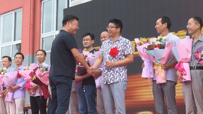 大会在雄壮的国歌声中拉开序幕,仁和镇党委书记王建新致开幕辞,向获奖教师表示了热烈的祝贺并向全校教职员工致以节日的问候。大会对各年级推选出来的44位优秀教师及优秀班主任进行隆重表彰。获奖教师们均佩戴金色的绶带,接受领导们颁发的荣誉证书和学生志愿者们献上的节日鲜花。接着,王建新为学校27名优秀教师组成的九年级队伍,颁发了“优秀团队”奖,并授予奖杯。颁奖结束后,优秀教师代表杨丽娟发言,她深情分享了自己的心路历程和教学心得。最后,校长秦连江代表学校,向教师们、家长们和学生们提出了新学期的要求。
