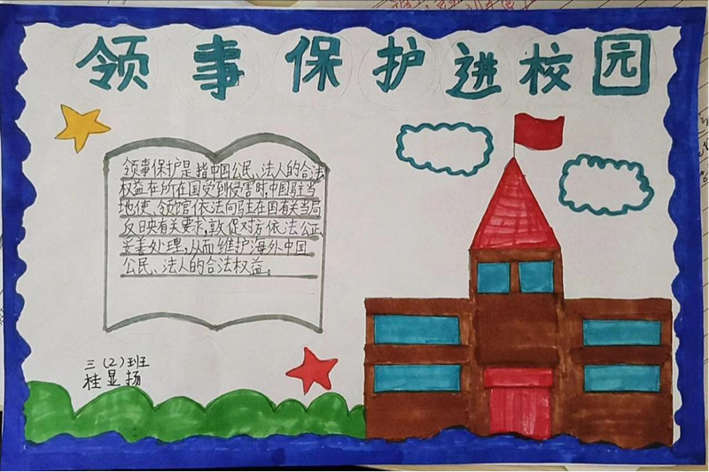 课下孩子们在家长的帮助下制作精美的手抄报,带动家庭、社会学习领事知识,了解中国领事知识,进一步树立安全防范意识。