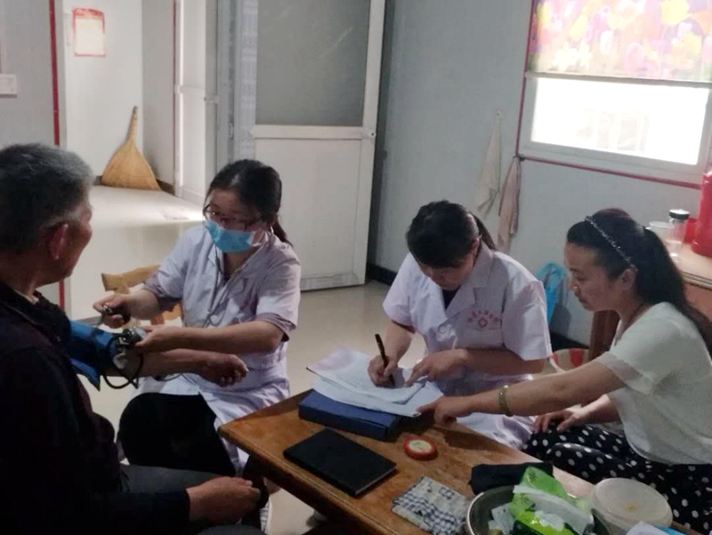 潢川网9月15日讯 2018年9月15日下午,潢川县白店乡肖围村第一书记陈晶晶同该村村医肖玉国医师及其两个助手一同前往建档立卡贫困户家中进行访诊。为他们测量血压、血糖,查看近期用药情况,对其身体状况进行认真仔细的检查、问诊,提示应注意事项、预约了下期访诊时间。