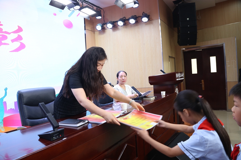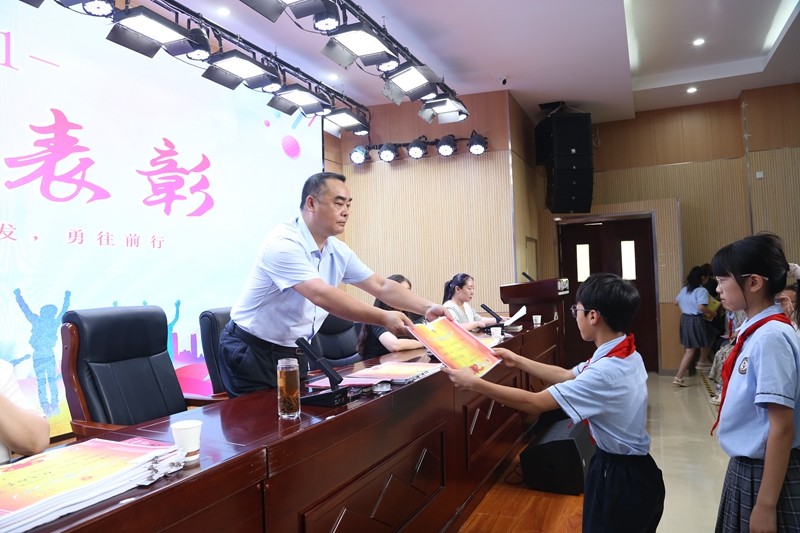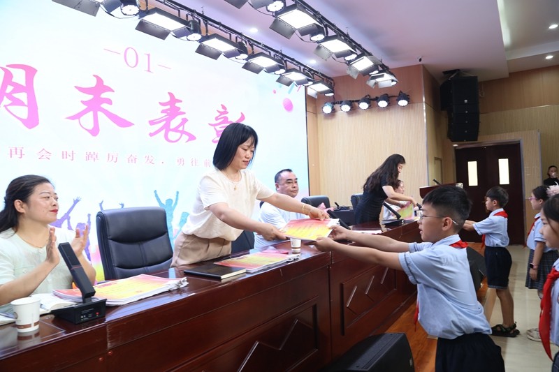一学期以来,学校涌现了一批积极向上、品德优良、成绩优秀的同学和班风学风优秀的班集体,他们不仅自身追求卓越,也为其他同学和班集体起到了榜样示范作用。艺术中心主任殷姗娜宣读表彰名单,并向同学们表示热烈祝贺。校领导亲切地为荣获“优秀班长”、“优秀路队长”、“纪律之星”、“礼仪之星”、“安全小卫士”、“优秀校值日生”“社团之星”等荣誉称号的队员们颁发了奖状和奖品,成绩的背后凝聚的是老师们、同学们一次次付出的辛勤汗水。 一步一脚印,一岁一成长。在这个充满希望的夏季,收获沉甸甸的果实,一批积极进取、刻苦认真的同学们脱颖而出,一张张荣誉证书便是对老师和孩子们最好的激励,也是对自己最好的交代。他们的踏实认真、勤奋刻苦,赢得了赞扬的掌声。