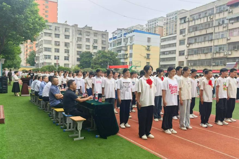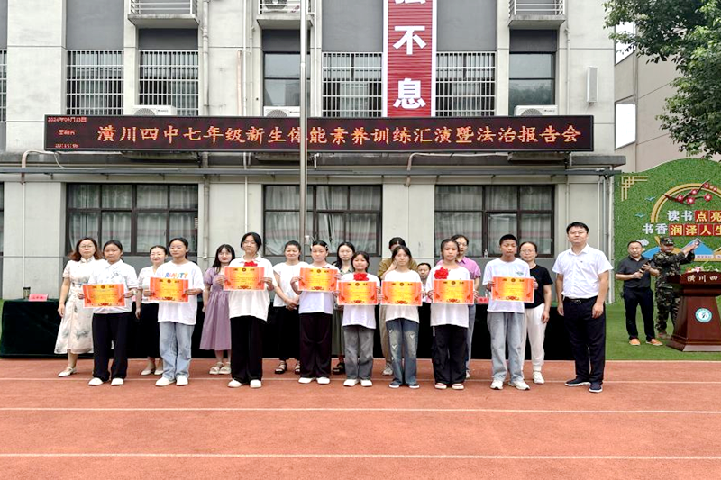 本网讯(舒贤连)在烈日下见证成长,在风雨中绘就篇章,成长与蜕变在这里发生。为展现同学们军训期间的风采,见证七年级新生的成长。9月6日,潢川四中隆重举行2024-2025级七年级新生体能素养训练汇演暨法治报告会。县巡特警大队副大队长王雪刚,南城派出所副所长夏志豹到场指导,学校党支部书记、校长曹伟,党支部副书记蔡红,副校长周全兵、吴耀俊、张东林、张宗海,工会主席、七年级负责人熊启强,小学部负责人宋大华,县巡特警大队部分代表、50多位家长代表、七年级班主任和七年级600多名同学参加活动。