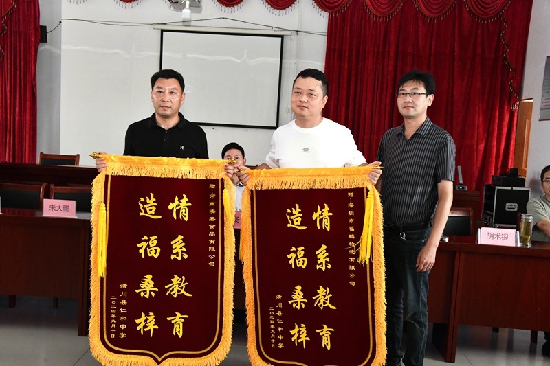 随后,现场举行了隆重的捐赠仪式,朱大鹏、刘杰为仁和中学捐赠了现金和丰富的奖品。为表达感激之情,学校向爱心人士回赠了“情系教育 造福桑梓”的锦旗,这面锦旗不仅是对爱心企业家善举的高度赞誉,更是学校与社会爱心力量紧密相连的象征。