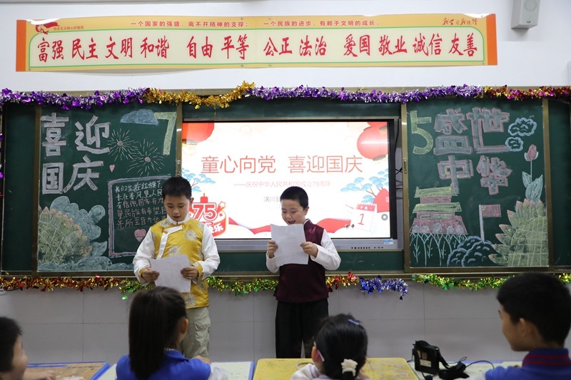 本网讯(贾书婷)山河披锦绣,盛世谱华章。在这丹桂飘香的金秋时节,迎来了祖国母亲的第75个华诞。潢川县逸夫小学为弘扬爱国主义精神,加强青少年爱国主义教育和思想引领,让家国观念、爱国意识在孩子们心中牢牢扎根,在国庆节来临之际,各班组织开展了“童心向党 喜迎国庆”主题班会,全校师生共同参与,用满满的热情为祖国母亲送上最真挚的祝福。