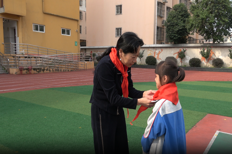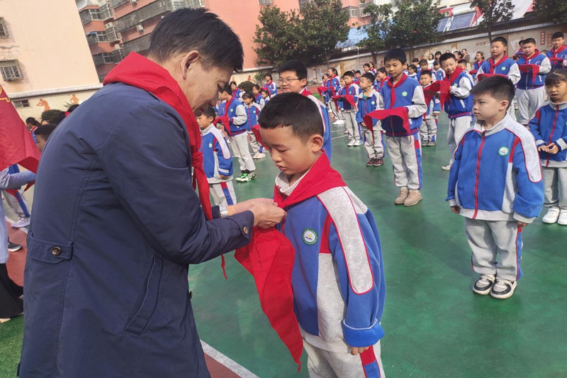 校领导和老队员们为二年级新队员佩戴红领巾,鲜艳的红领巾在胸前飘扬,无声地自豪溢于言表。