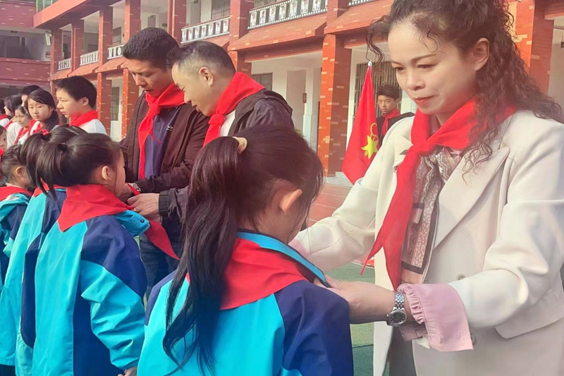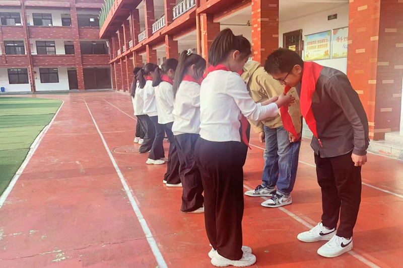 上午8点20,随着“红领巾飘起来”的旋律响起,优秀少先队员为北校领导敬献了红领巾,主持人宣布新队员入队仪式正式开始。