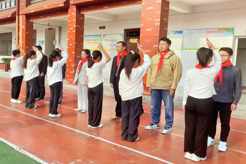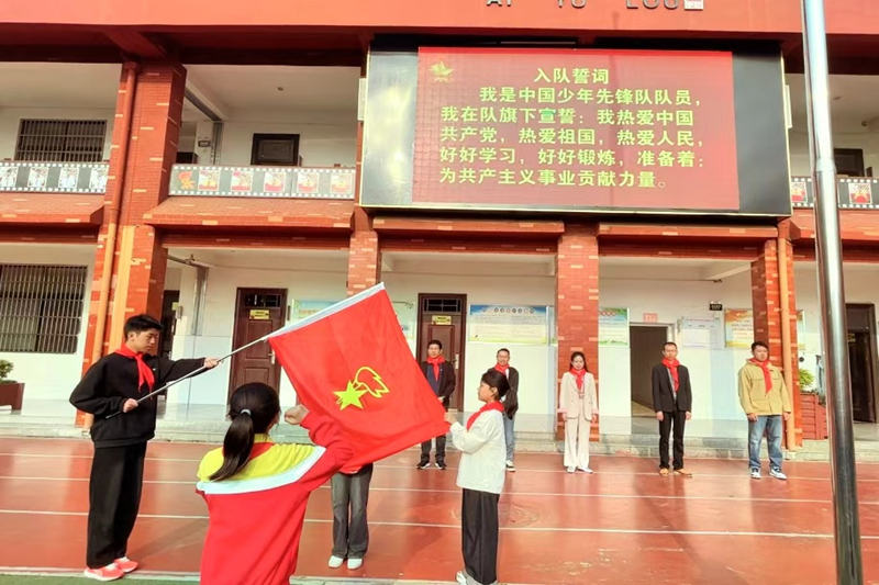宋奕带领新队员面向队旗,高举右拳,庄严宣誓,立誓为共产主义事业贡献力量,神圣的誓言在校园上空久久回荡。
