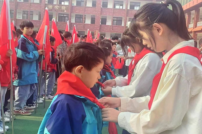 北校大队辅导员赵威宣读了入队批准书并命名了一年级五个新中队,75名同学光荣的加入了中国少年先锋队。北校领导和优秀少先队员代表为新队员戴上了鲜艳的红领巾,他们互敬队礼,表达对红领巾的神圣敬意,新队员们凝视着胸前的红领巾,喜悦与激动洋溢在脸上。