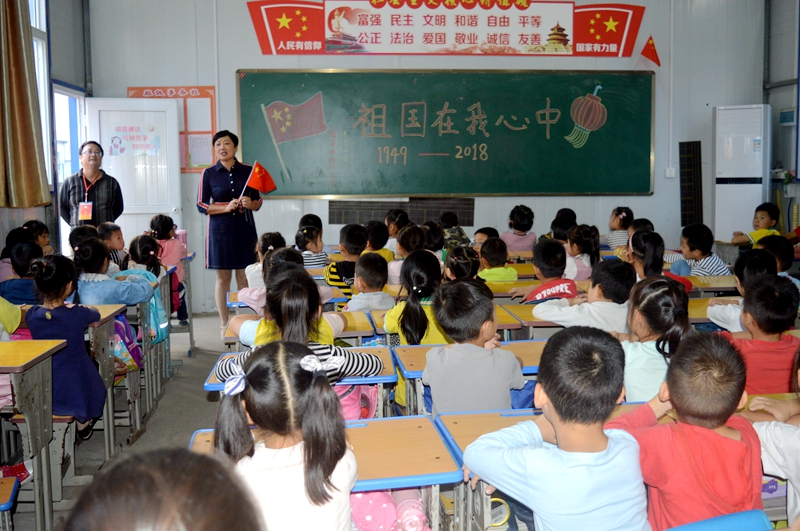潢川网讯(张桂兵 周晶)为了激发同学们的爱国热情,增强民族自信心和自豪感,在中华人民共和国成立69周年国庆节来临之际,2018年9月30日下午,潢川县逸夫小学校园一派喜气,一到六年级各班在班主任和中队辅导员老师的精心组织下,都在忙着举行庆国庆主题班会活动,庆祝第69个国庆节。老师和同学们一块布置教室,有的在黑板上画班会主题,有的教室外面门上、窗户上插上了小国旗,教室里悬挂了拉花、气球等装饰物,博雅楼上的教室都利用电子白板打出了主题背景,一时校园内充满了欢声笑语。